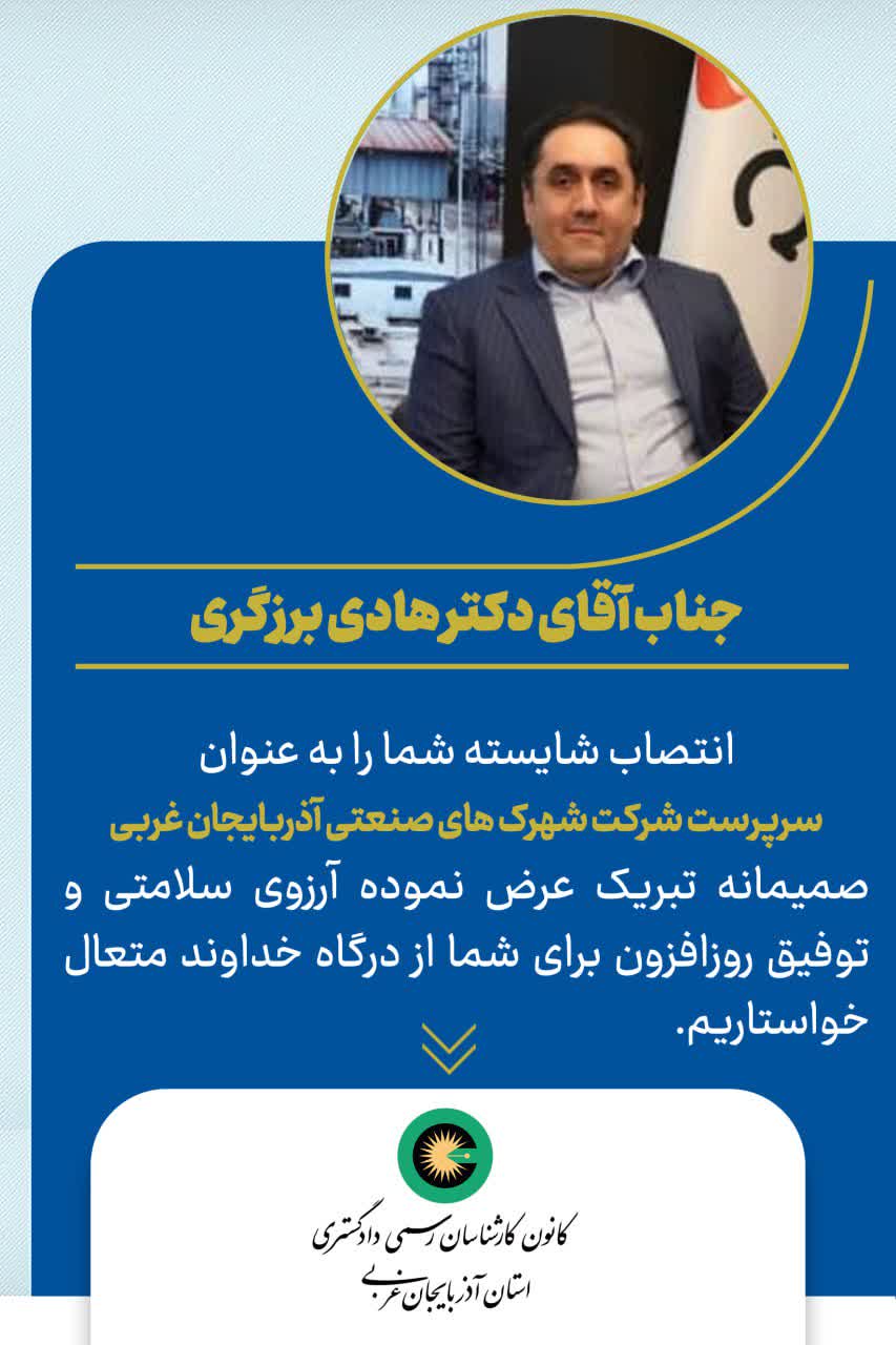 تبریک جناب آقای هادی برزگری جهت انتخاب شایسته ایشان به عنوان سرپرست شرکت شهرک های صنعتی آذربایجان غربی