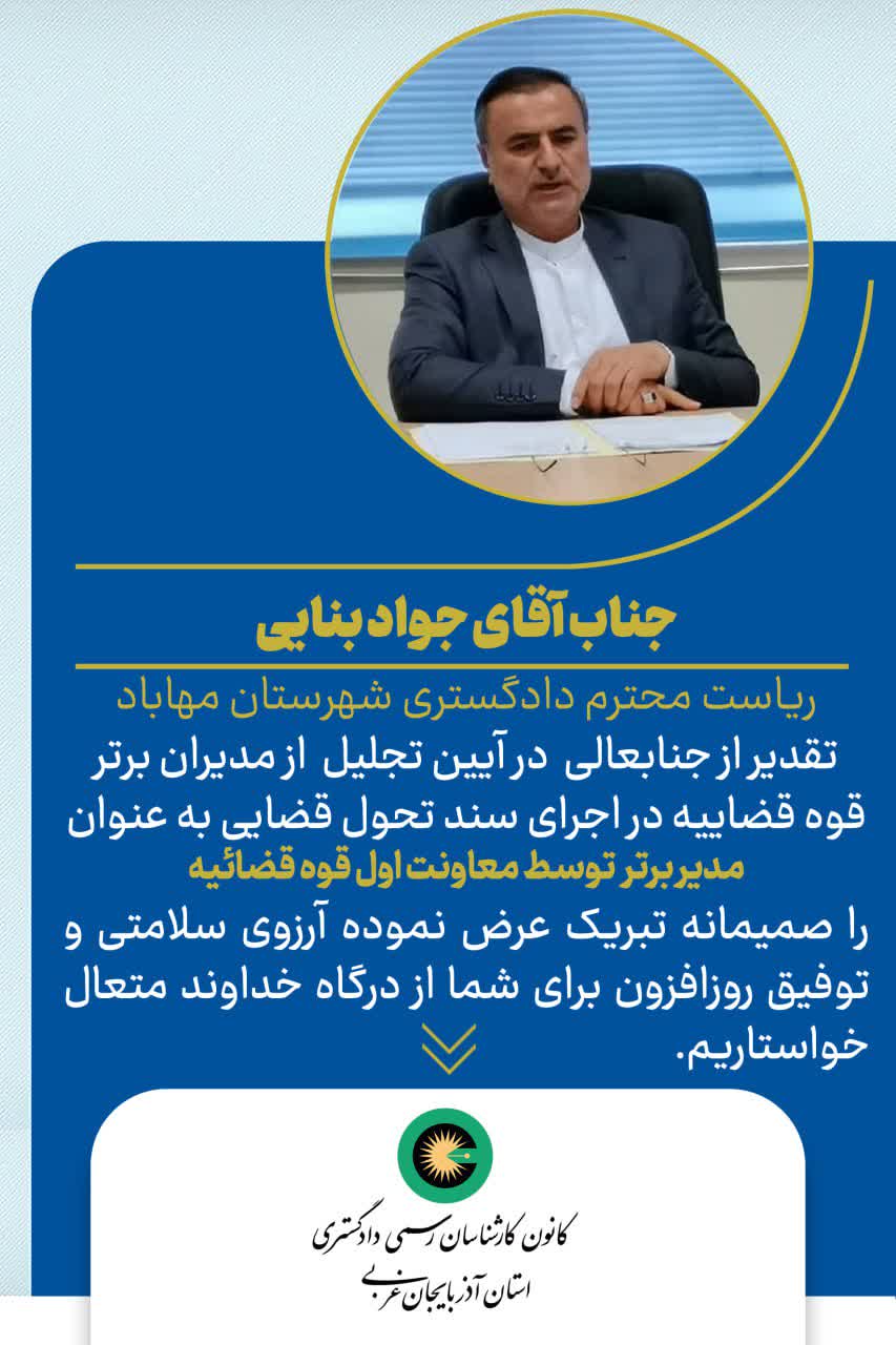 تقدیر از جناب آقای جواد بنایی ریاست محترم دادگستری شهرستان مهاباد به عنوان مدیر برتر توسط معاون اول قوه قضائیه