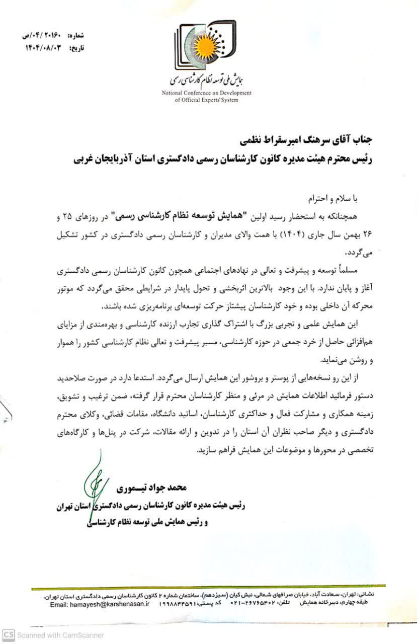 نامه رئیس هیئت مدیره کانون کارشناسان رسمی دادگستری استان تهران به ریاست کانون آذربایجان غربی با موضوع برگزاری همایش توسعه نظام کارشناسی رسمی