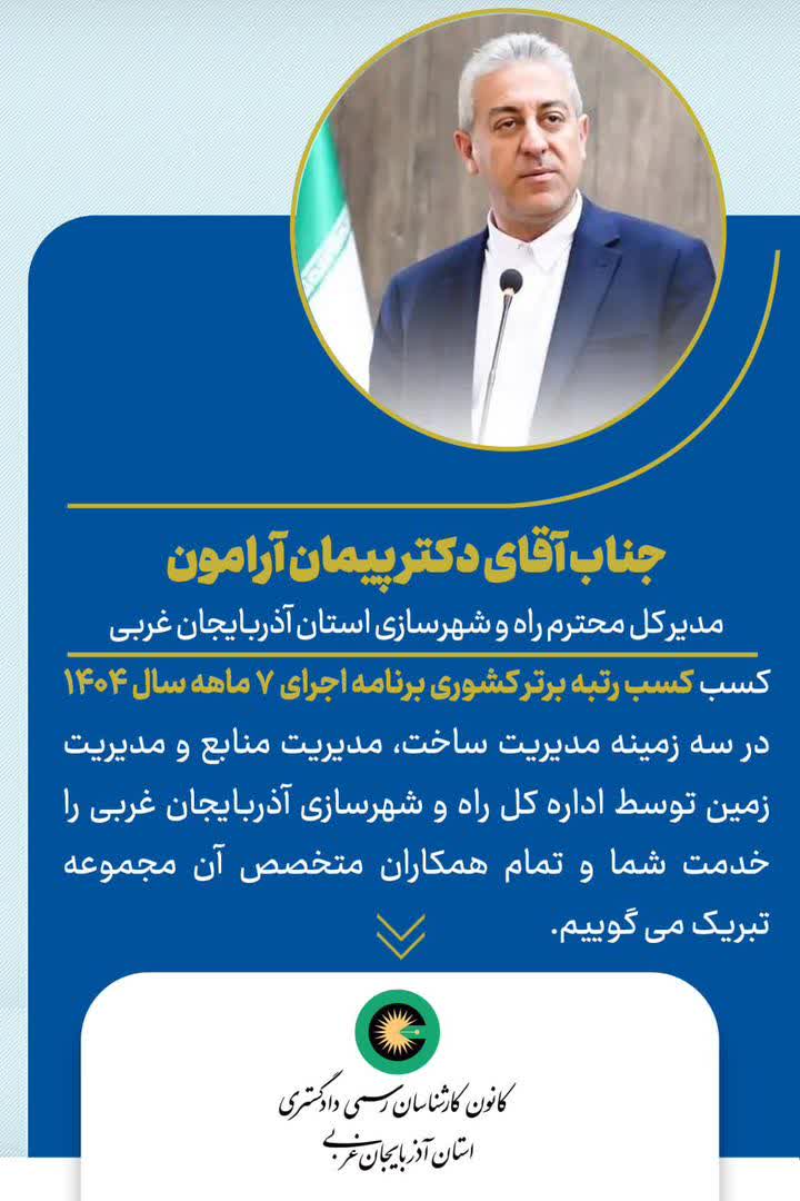 کسب رتبه برتر کشوری برنامه اجرای 7 ماهه سال 1404 توسط جناب آقای دکتر پیمان آرامون